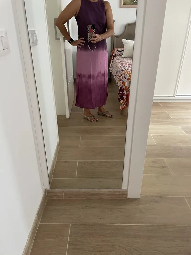 Élégante et confortable, cette robe sans manches en dégradé est le choix parfait pour l'été. Sa jupe A et ses couleurs tendance en font un atout incontournable pour chaque occasion estivale.
